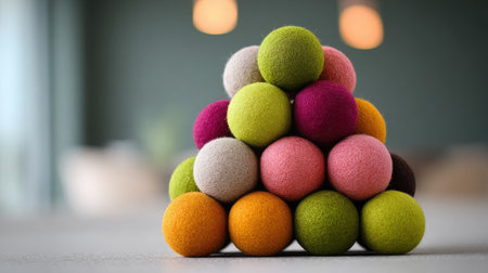 This captivating image showcases a lineup of colorful textured balls on a vibrant surface, creating an engaging visual composition with soft lighting and shadows.