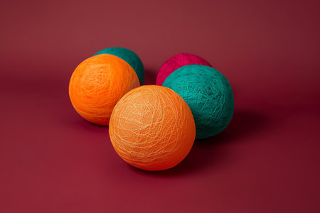 colorful balls of yarn on a red background, close-up