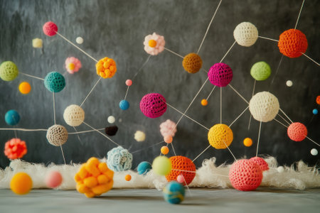 Brightly colored crochet balls float in an artistic arrangement, showcasing creativity and craftsmanship.