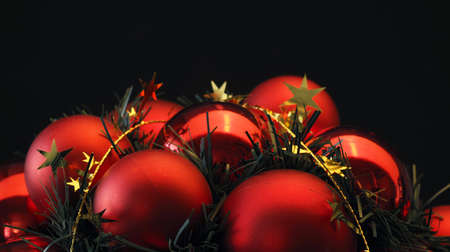 Red Christmas balls on a black background, seasonal holiday background, greetings card