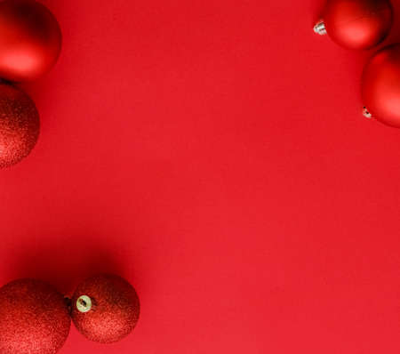 Christmas and New Year red balls with copy space on red backdrop.