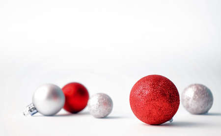 Christmas tree toys on a white background. Christmas decorations on a white surface. Balls and garland of red and silver colors on the table.