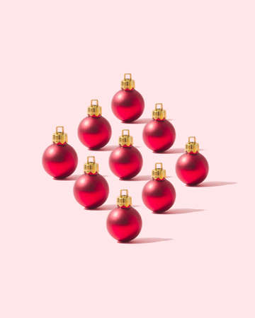 Red Christmas baubles organized in a rhombus shape over pink background