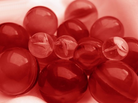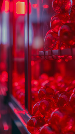 Close up of red glass balls in a production line. Shallow depth of field.