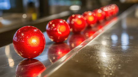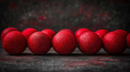 close-up image showcasing a row of red balls arranged on a dark podium. The balls are textured and evenly spaced, creating a visually appealing composition against a blurred background.