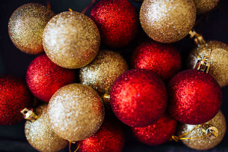Close up of red and golden Xmas balls decoration pile. Overview of shiny baubles. Festive backdrop.