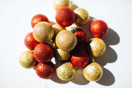 Top view photo of red and gold christmas tree balls on isolated red background