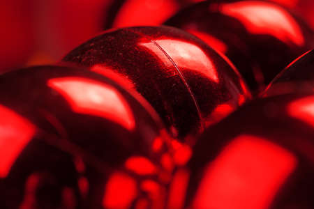 Red Christmas balls close up. Christmas background. Lots of shiny beautiful Christmas balls. Decoration for the new year.