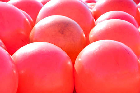 Red or pink life buoy balls on the pier in Norway, Stavanger. They are surrounding a childrens nautical themed play area. Used for anchoring and mooring, Stavanger, Norway.