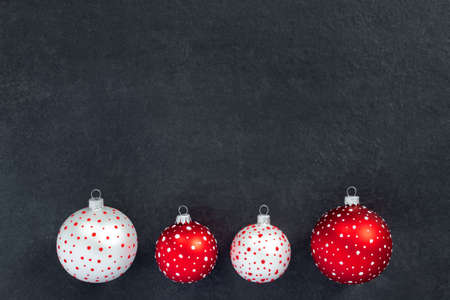 Festive set of white and red new year toys balls on black background. Christmas banner, winter decoration. Minimal celebration concept with copy space.