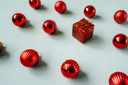 Red christmas balls on christmas decoration, top view
