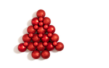 Christmas red baubles laid out in the shape of a Christmas tree. New Year decorations isolated on white background. Top view, flat lay.