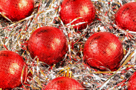 Red christmas baubles background. Christmas ornaments.
