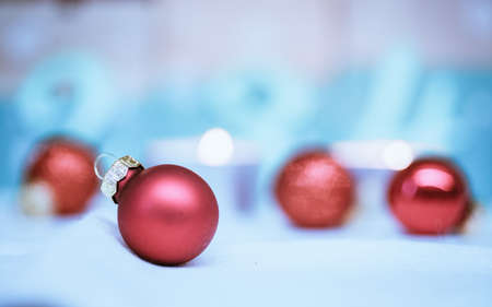 Christmas decoration: Close up of red Christmas baubles, advent calendar in the blurry background