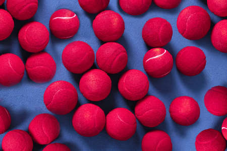 Beautiful red small decorative balls are scattered on a red background. Top view, flat lay