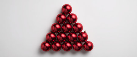 Red Christmas ornaments are neatly arranged to form a triangle on a light background. This arrangement provides a unique design for holiday decor.