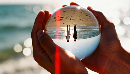 Hands hold a crystal ball capturing an inverted beach scene with two figures, ocean reflections and warm sunlight. The blurred bokeh background provides open space available for text and design placement