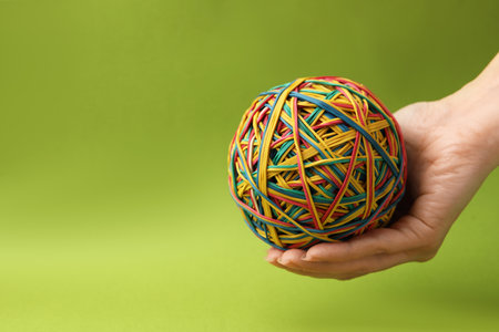 Woman with ball made of many colorful rubber bands on green background, closeup. Space for text