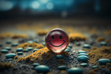 One small transparent smiley face, among colored stones, hyper-realistic style. Generative AI.