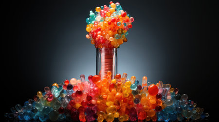 Colorful beads in a glass vase on a dark background.