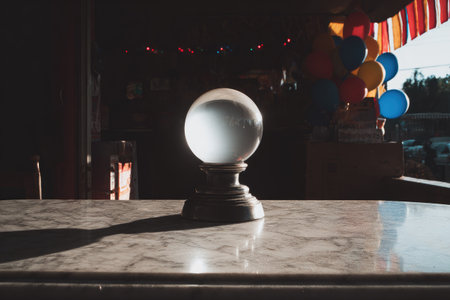 Clear glass crystal ball rests on a dark-colored pedestal atop a marble surface. The ball is illuminated by an ambient light source, casting soft shadows on the marble. A room with colorful balloons and a darker interior background is visible in the out-of-focus background. The surface is detailed with marble patterns and reflected light.