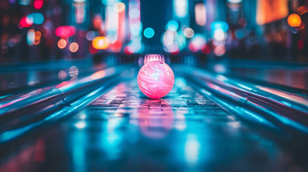 Neon bowling balls on glossy lane in trendy bowling alley, vibrant and modern ambiance.