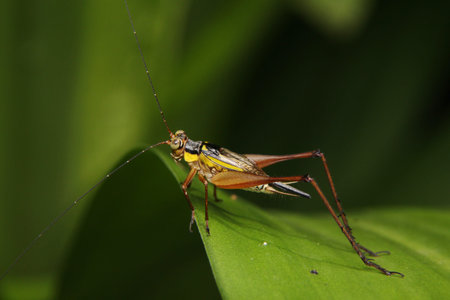 Macro Close Up Cricket insect on green leaf over black blur background. Selective focus