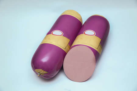 Boiled sausage isolate on a white background. Food, sausage. Sliced sausage on a cutting board.