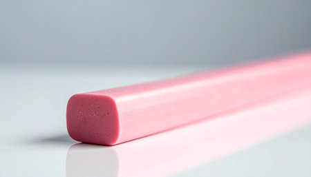 A single pink eraser stick with rounded edges rests on a reflective white surface with a soft grey background.