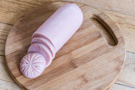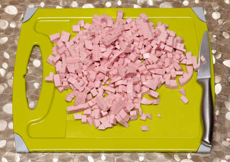 Chopped boiled sausage on a wooden board.