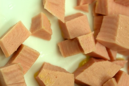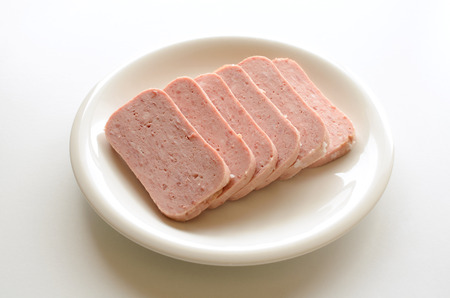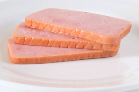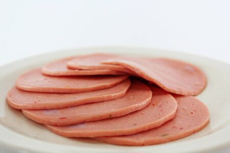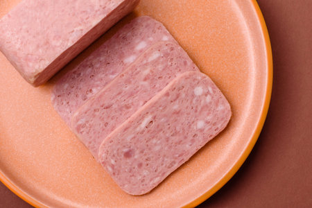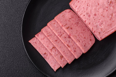 Spiced ham slices, canned meat for lunch sandwiches. Spiced ham as a food backdrop for your design.