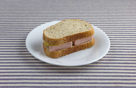 A pressed wheat bread pork canned meat sandwich on a white plate atop a blue striped tablecloth.