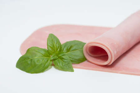 Sliced smoked sausage with green basil leaves. Selective focus.