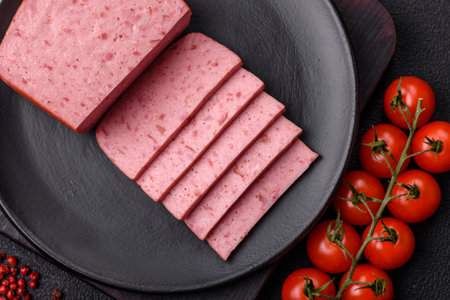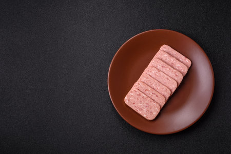 Canned ham, meat, pork, with spices and salt, slices on a dark concrete background