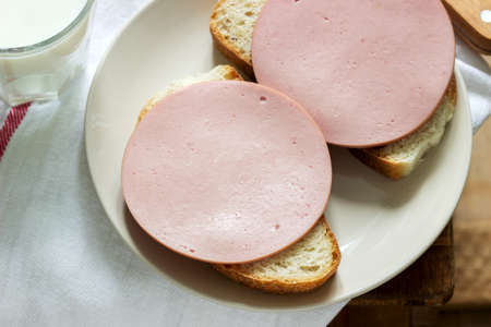 Sandwiches made of bread and boiled sausage, served with milk.