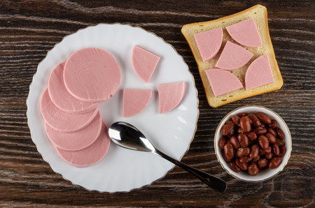 Teaspoon, slices of sausage in white plate, sandwich with sausage, bowl with lobio on dark wooden table. Top view