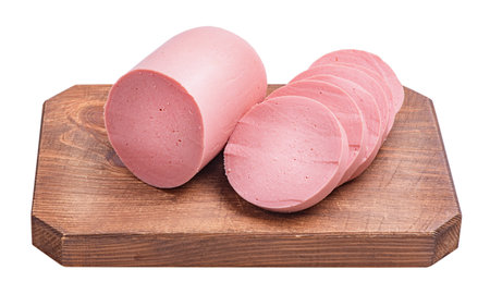 Bologna salami sliced on the wooden board, isolated on white background