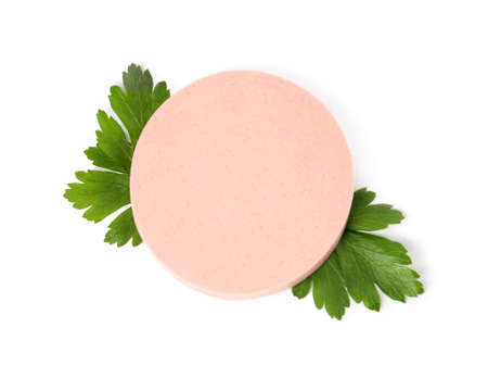 Slice of delicious boiled sausage with parsley on white background, top view