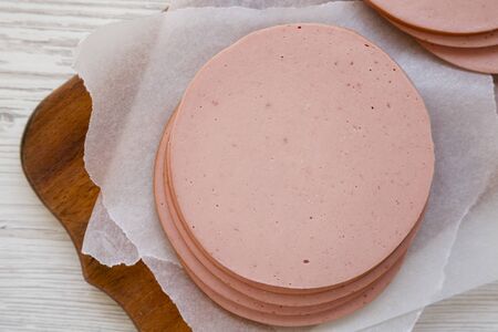 Sliced pork bolgna meat on a rustic wooden board on a white wooden surface, top view. Flat lay, overhead, from above.