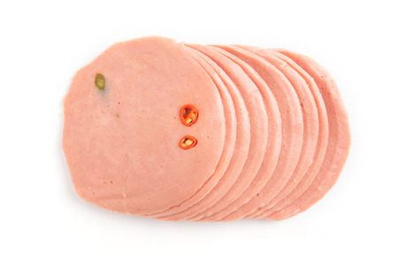 Boiled sausage slices isolated on white background.