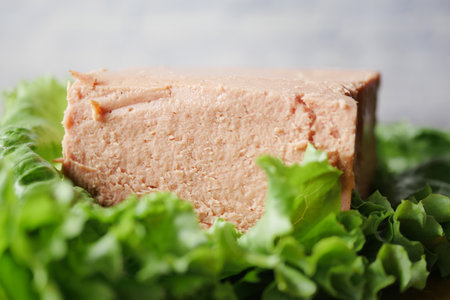 close up of canned meat on a chopping board on table