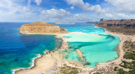 Aerial view of Balos beach near Gramvousa island in Crete. Magical turquoise waters, lagoons, Balos beach of pure white sand. Balos bay in Crete island, Greece.