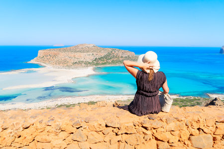 Tourist woman with straw hat looking at beautiful Mediterranean Sea landscape of Balos beach on Crete island.