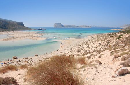 Crete coast, Balos bay, Greece. Amazing sand strand, sea of turquoise and blue colors with the ship. Popular touristic resort. A landscape on a summer sunny day.