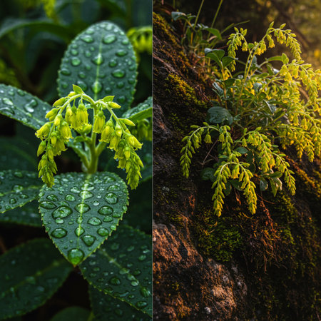 Collage of two photos of yellow flowers with raindrops on the leaves