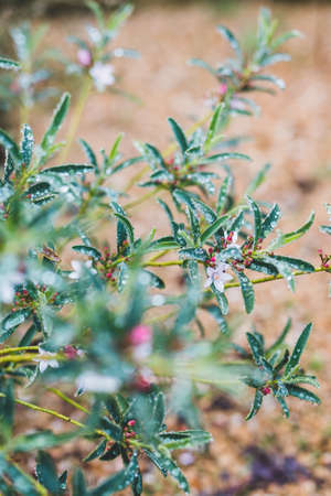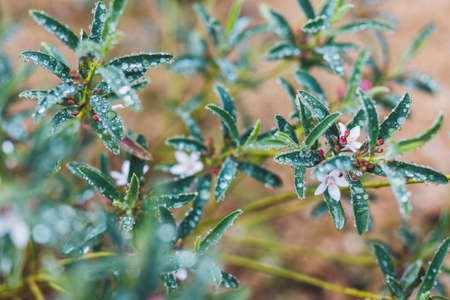 eriostemon philotheca plant with pink flowers with raindrops and frost on its leaves, close-up shot at shallow depth of field