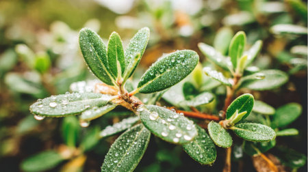 Explore the beauty of fresh green leaves adorned with water droplets, capturing nature's serenity in an outdoor setting. Perfect for nature-themed projects.