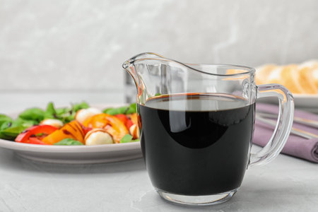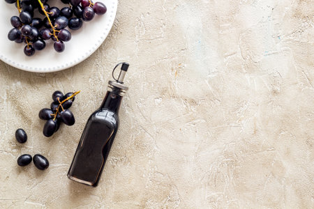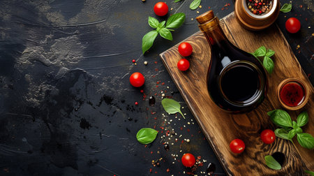 Organic balsamic vinegar, tomatoes and greens on gray table