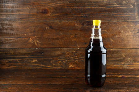 Soy sauce in a glass bottle on a wooden background. Selective focus.