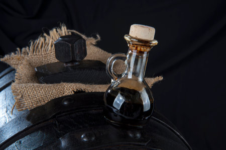 Traditional balsamic vinegar of Modena in a small bottle on a wooden barrel